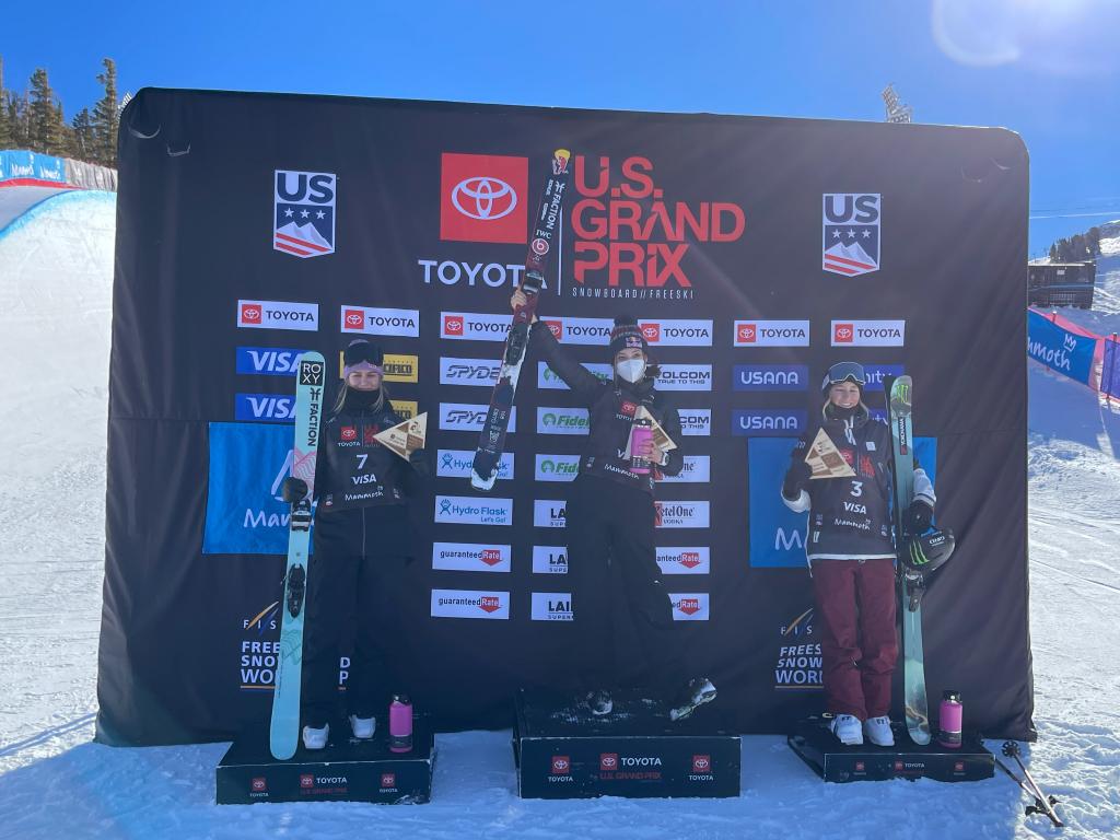 1月8日,中國選手谷愛凌(中)在國際雪聯自由式滑雪世界杯美國猛犸山站奪得U型場地項目冠軍,同時以本賽季世界杯U型場地項目四站全勝的成績,獲得了象征該項目賽季總冠軍的水晶球。新華社發(李揚攝)