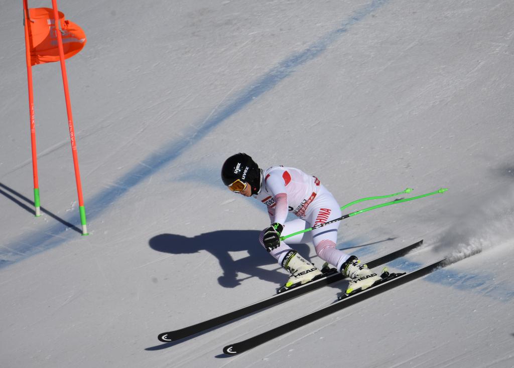 2020年1月20日,第十四屆全國冬季運動會高山滑雪速度類女子超級大回轉比賽,黑龍江代表隊選手倪悅名在比賽中。新華社發(任超攝)