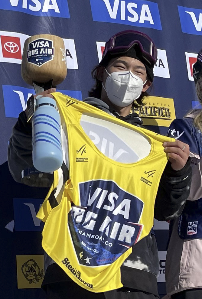 2021年12月4日,在2021-2022賽季單板滑雪大跳臺世界杯美國斯廷博特站男子組頒獎儀式上,中國選手蘇翊鳴慶祝奪冠。新華社發(李揚 攝)