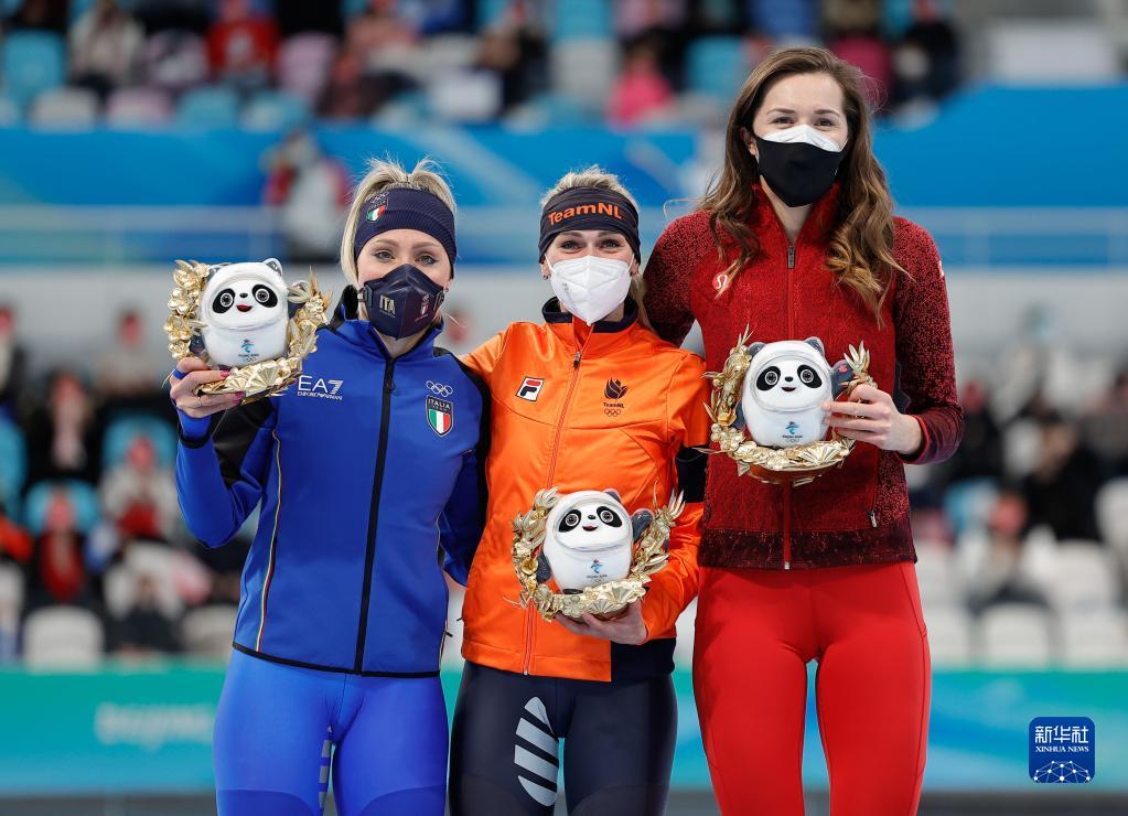 2月5日,冠軍荷蘭選手伊雷妮·斯豪滕(中)與亞軍意大利選手弗蘭切絲卡·洛洛布里吉達(左)、季軍加拿大選手伊莎貝爾·韋德曼在頒獎儀式上。