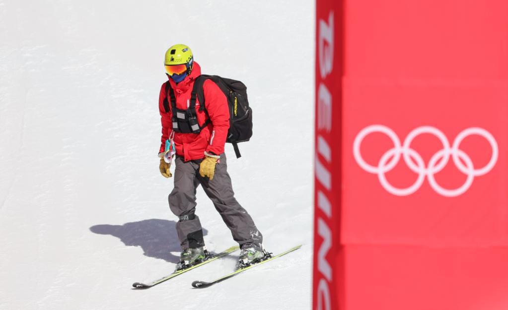 2月6日,男子滑降比賽宣布延期舉行后,一名工作人員從雪道上滑下。新華社記者陳斌攝