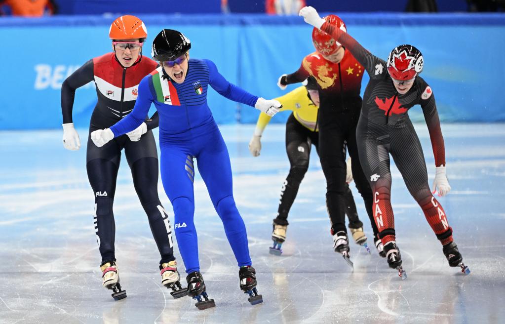 2月7日,意大利選手豐塔納(前)在奪冠后慶祝。當日,在首都體育館舉行的北京2022年冬奧會短道速滑女子500米決賽中,意大利選手豐塔納奪得冠軍。新華社記者李一博攝