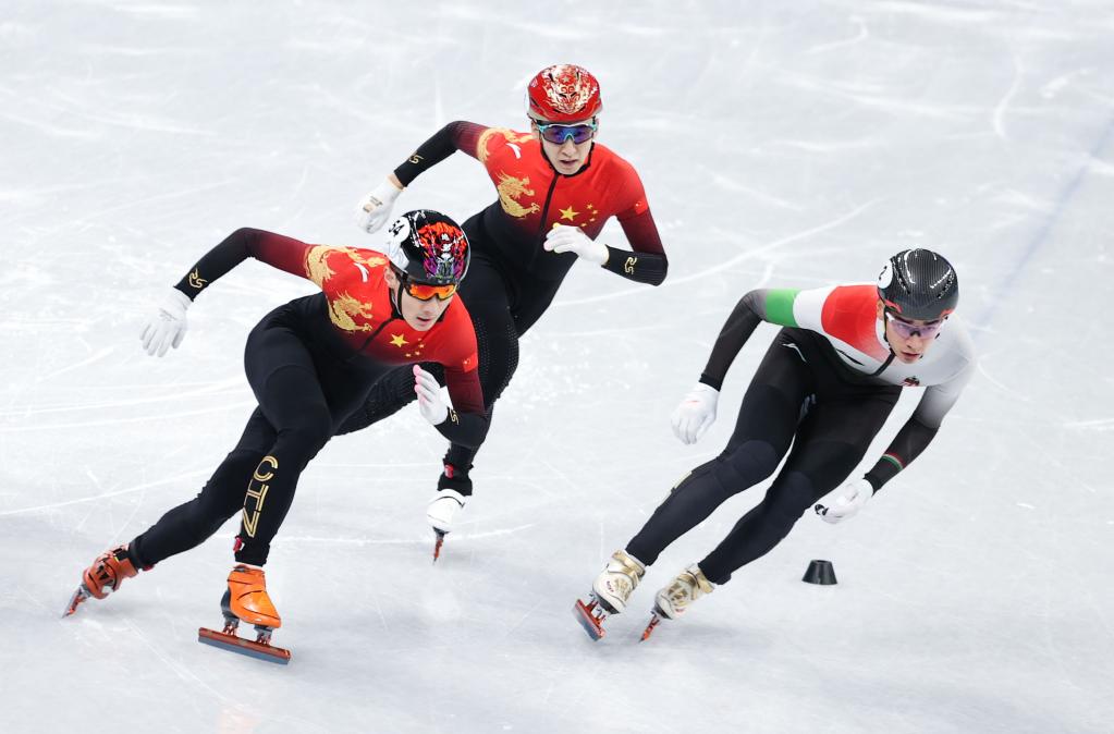 2月7日,任子威(左)與隊友武大靖(中)在比賽中。當日,在首都體育館舉行的北京2022年冬奧會短道速滑男子1000米決賽中,中國選手任子威奪得冠軍。新華社記者楊磊攝