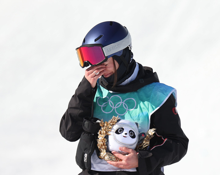 2月8日,冠軍中國選手谷愛凌在北京2022年冬奧會自由式滑雪女子大跳臺獎牌頒發儀式上。新華社記者鞠煥宗攝