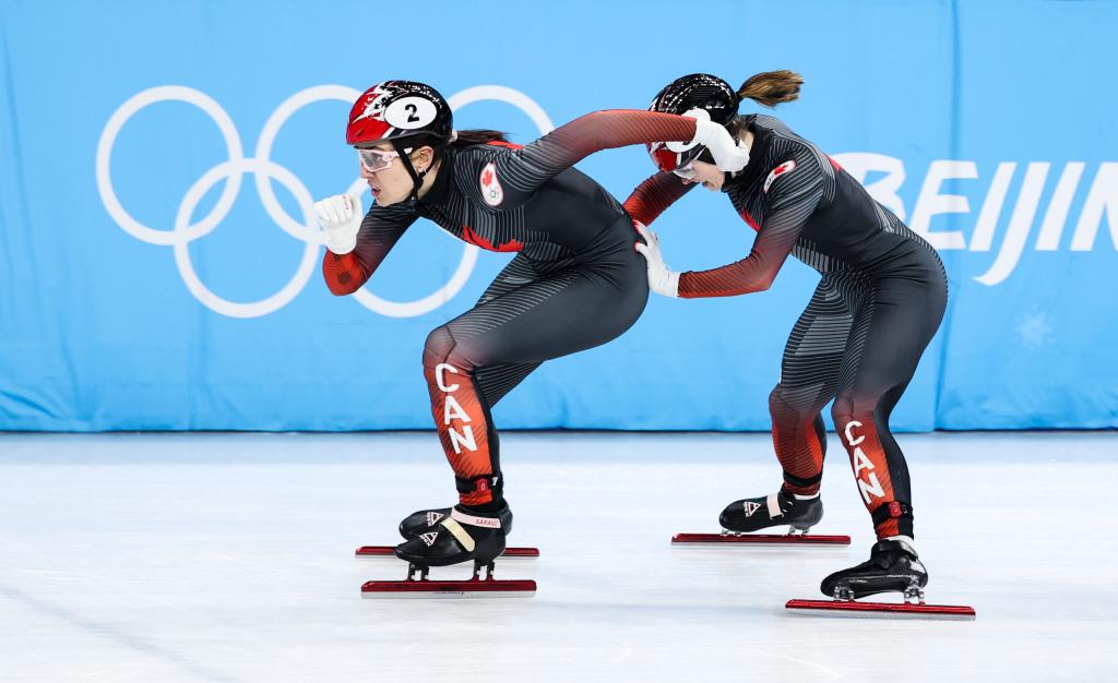 2月9日,加拿大隊選手考特妮·薩羅(左)在比賽中。加拿大隊以4分5秒893的成績晉級A組決賽。