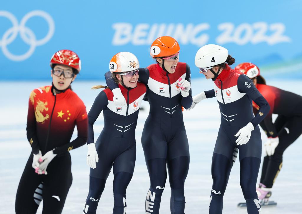 2月9日,荷蘭隊選手婭拉·范凱爾霍夫(左二)、蘇珊娜·舒爾廷(左三)和塞爾瑪·保茨馬(左四)在比賽后慶祝。荷蘭隊以4分4秒133的成績晉級A組決賽。