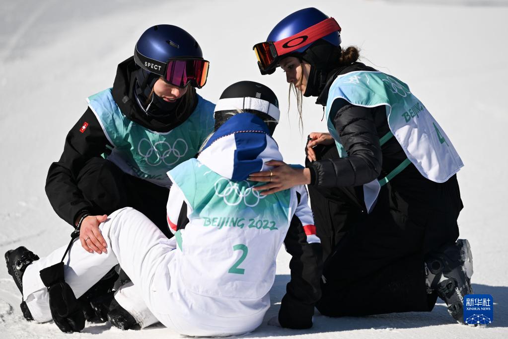 2月8日,中國選手谷愛凌(右)和瑞士選手瑪蒂爾德·格雷莫德(左)在自由式滑雪女子大跳臺決賽后安慰法國選手泰絲·勒德。新華社記者 薛宇舸 攝