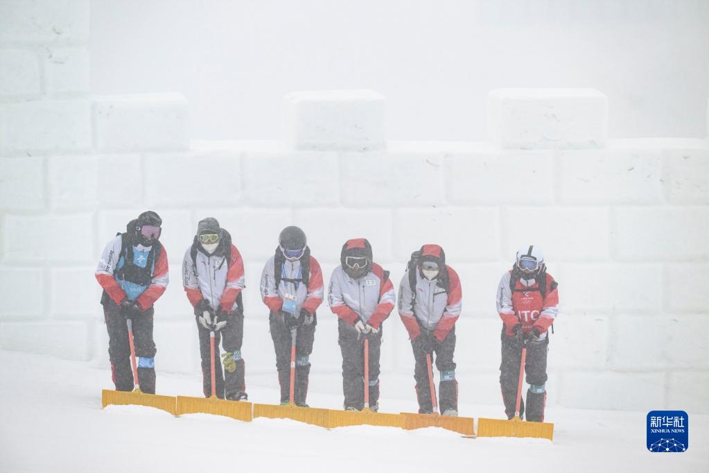 2月13日,工作人員在原定于上午10時舉行的北京2022年冬奧會自由式滑雪女子坡面障礙技巧資格賽現場進行清雪工作。新華社記者肖藝九攝