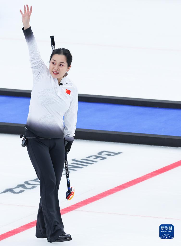 2月13日,中國隊選手王芮在北京冬奧會冰壺女子循環賽后向觀眾致意。新華社記者王婧嬙攝