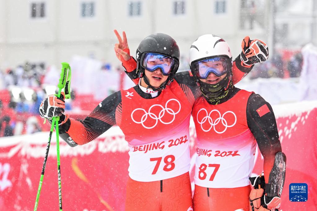 2月13日,中國選手徐銘甫(左)和張洋銘在北京冬奧會高山滑雪男子大回轉(zhuǎn)比賽后合影。新華社記者連振攝