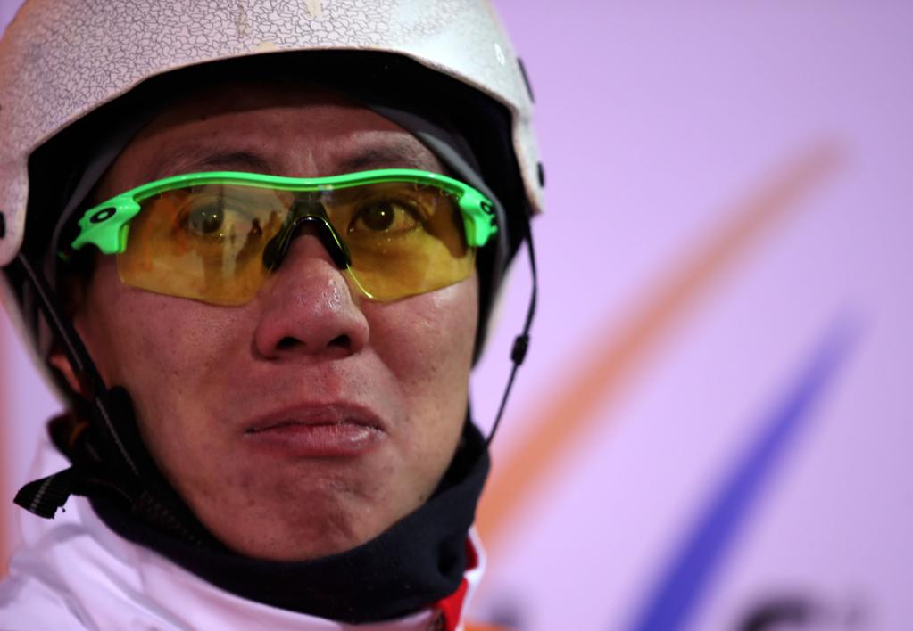 2018年2月18日,中國選手賈宗洋在2018年平昌冬奧會自由式滑雪男子空中技巧決賽成績公布后。新華社記者費茂華攝