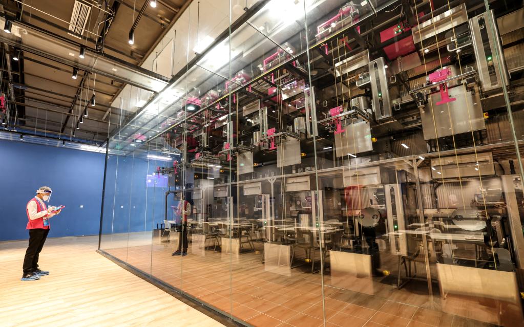 1月26日,一名工作人員正在主媒體中心媒體餐廳查看運菜機器人工作。新華社記者楊磊攝