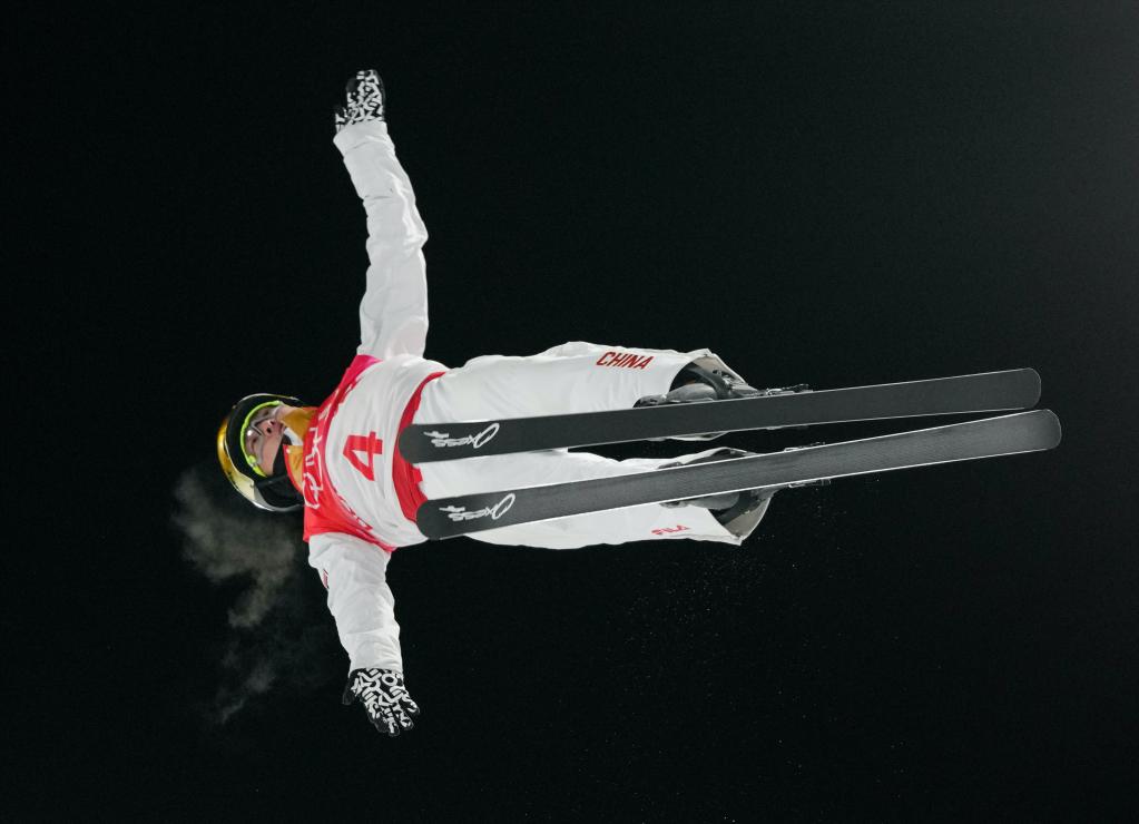 2月16日,中國選手齊廣璞在北京冬奧會自由式滑雪男子空中技巧決賽中。新華社記者朱崢攝