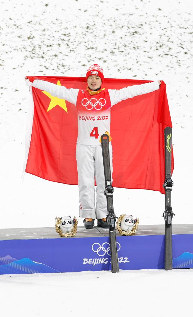 2月16日,中國選手齊廣璞在北京冬奧會自由式滑雪男子空中技巧決賽獲得冠軍后慶祝。新華社記者肖藝九攝