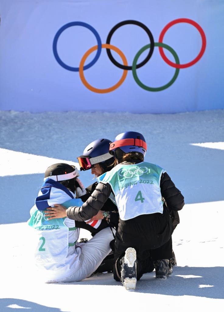 2月8日,谷愛凌(右)和瑞士選手瑪蒂爾德·格雷莫德(中)在比賽后安慰法國選手苔絲·勒德。新華社記者武巍攝