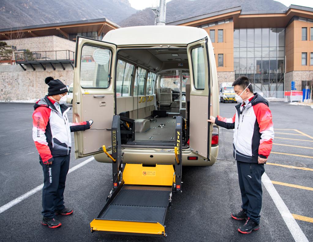 工作人員在國家高山滑雪中心展示場館內的無障礙車輛。新華社記者孫非攝
