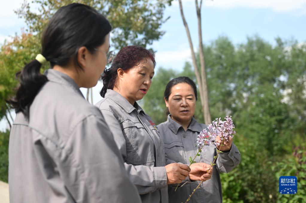 在青海省西寧市林業科學研究所的培育基地內,張錦梅(中)與同事在比較兩株丁香花束的異同(9月14日攝)。新華社記者 張龍 攝