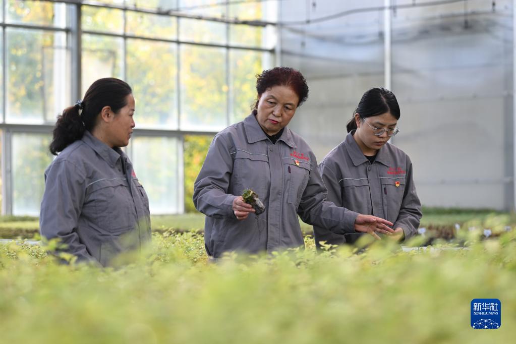 在青海省西寧市林業科學研究所的溫室內,張錦梅(中)與同事在查看種苗(9月14日攝)。新華社記者 張龍 攝