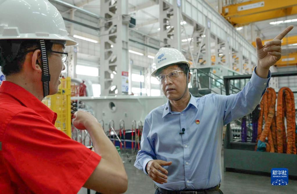 在金風(fēng)科技新疆達(dá)坂城風(fēng)電裝備產(chǎn)業(yè)基地零碳智能工廠內(nèi),武鋼(左)與技術(shù)工程師在一起交流(2022年8月6日攝)。新華社發(fā)