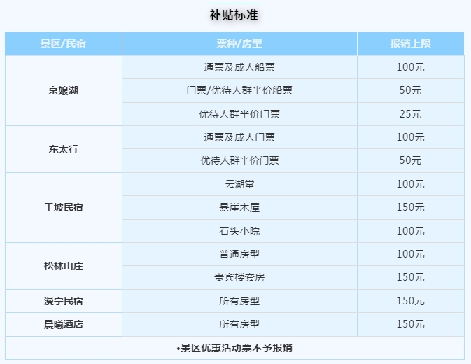 3.購買并使用以下景區票種/民宿酒店補貼標準:京娘湖景區、東太行景區,王坡民宿、松林山莊、漫寧民宿、晨曦酒店依據不同票種(房型),報銷上限為25—150元不等。