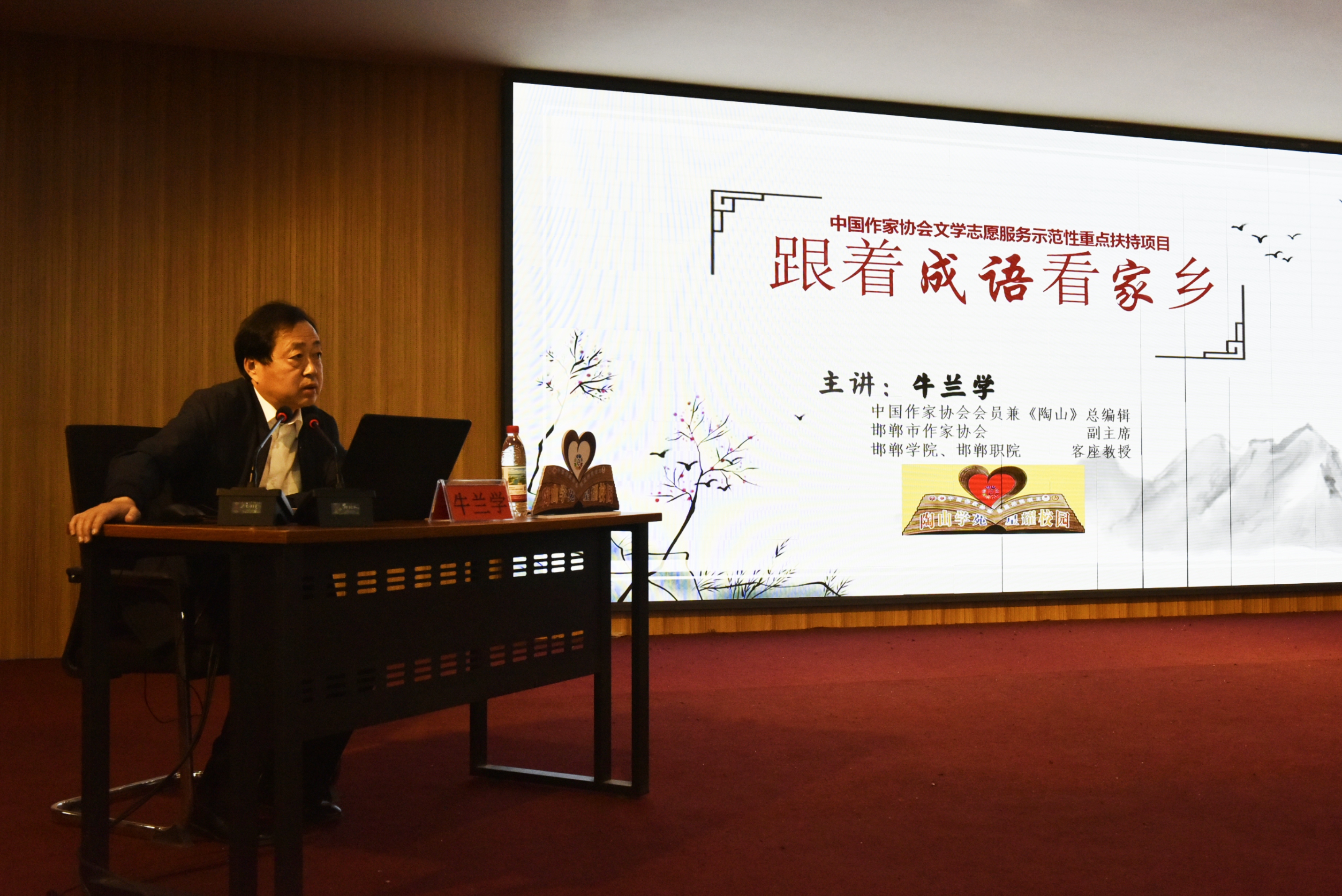 活動中,文學志愿團隊向第二實驗小學捐贈書刊100余冊。《陶山》總編輯牛蘭學進行題為《跟著成語看家鄉》的專題講座,通過有獎互動問答、視頻展播等形式,帶領學生穿越千年文脈,現場掌聲不斷,激發了同學們對家鄉和文學的熱愛之情。