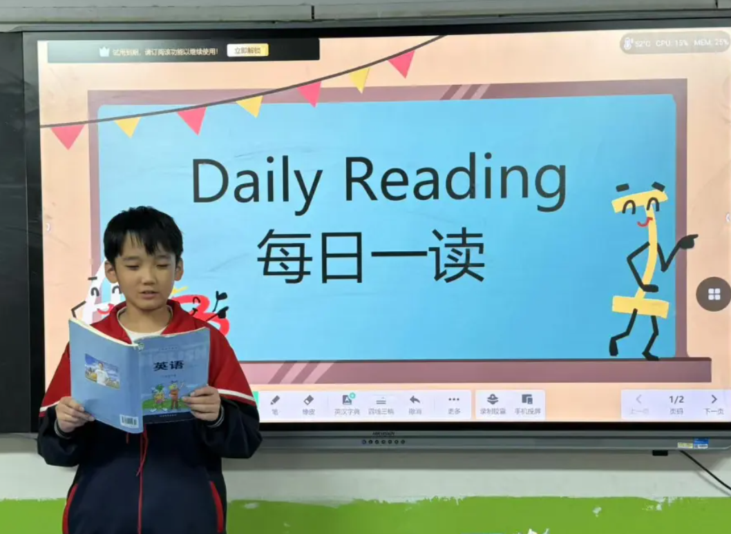 每天英語課前,學校都會有朗讀課文的活動,通過隨機點名和自愿報名的方式,同學們朗讀前一天學習的課文,借此提高學生的英語口語能力和核心素養,為同學們提供展示自己的平臺。