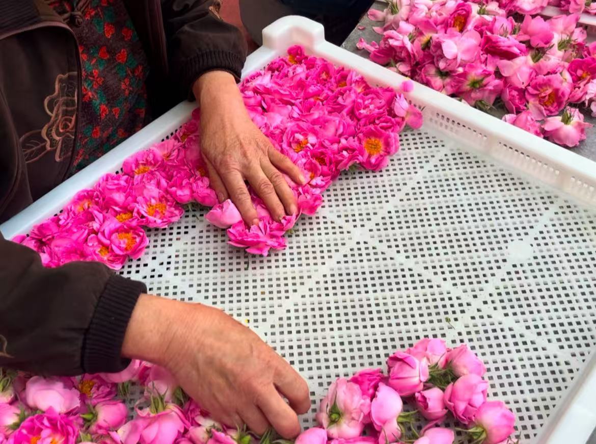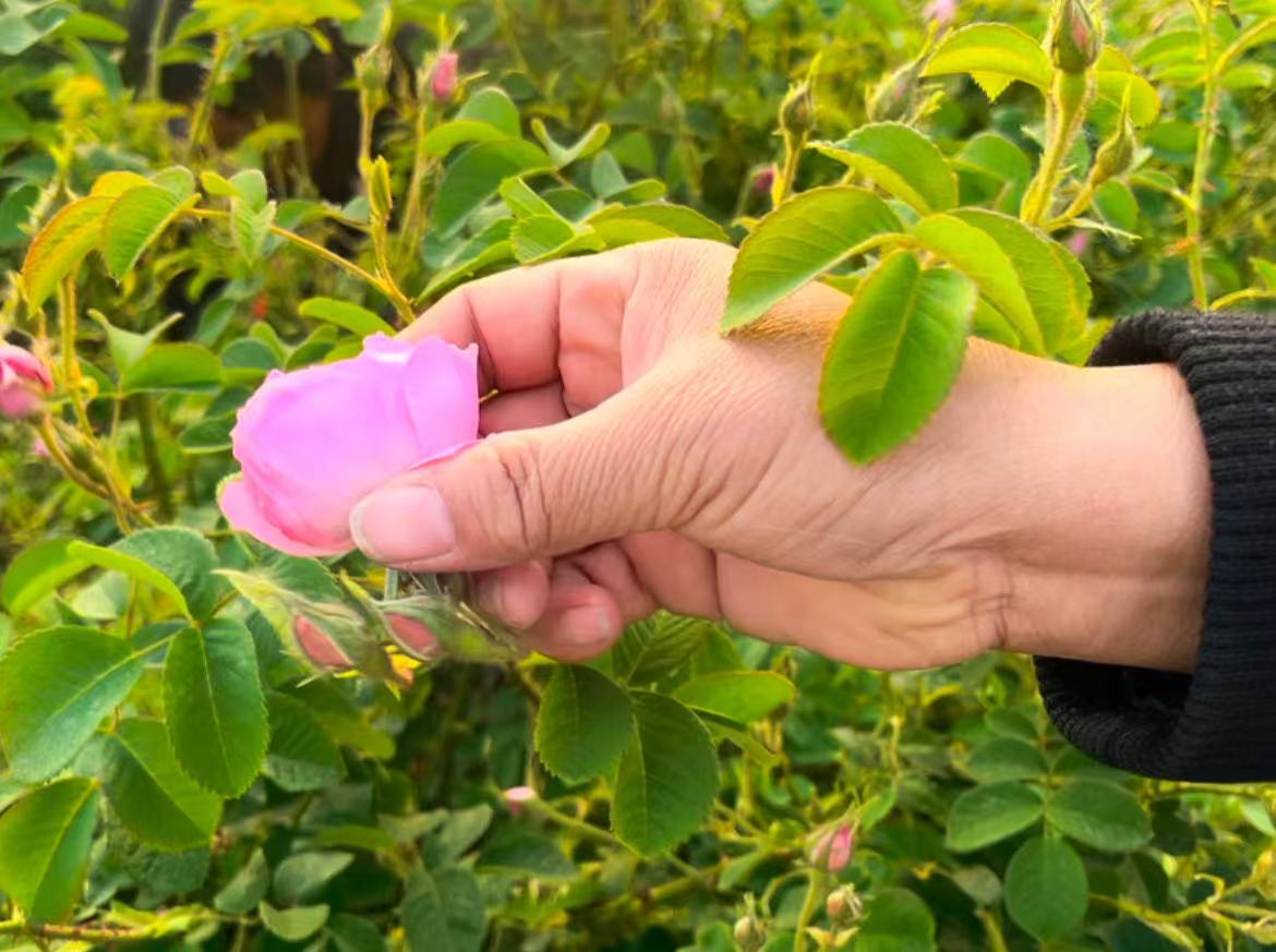 基地還招募成立專業(yè)摘花團(tuán)隊(duì),涵蓋從摘花到包裝各個(gè)流程,為農(nóng)戶提供更多的就業(yè)機(jī)會(huì);積極延伸產(chǎn)業(yè)鏈條,在原有鮮花銷售的基礎(chǔ)上,開發(fā)出玫瑰花茶、玫瑰精油、玫瑰護(hù)膚品等系列產(chǎn)品,進(jìn)一步提升玫瑰產(chǎn)業(yè)附加值,增加農(nóng)戶的收入來(lái)源。