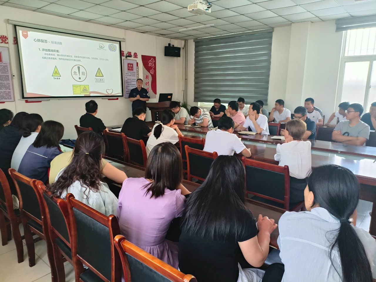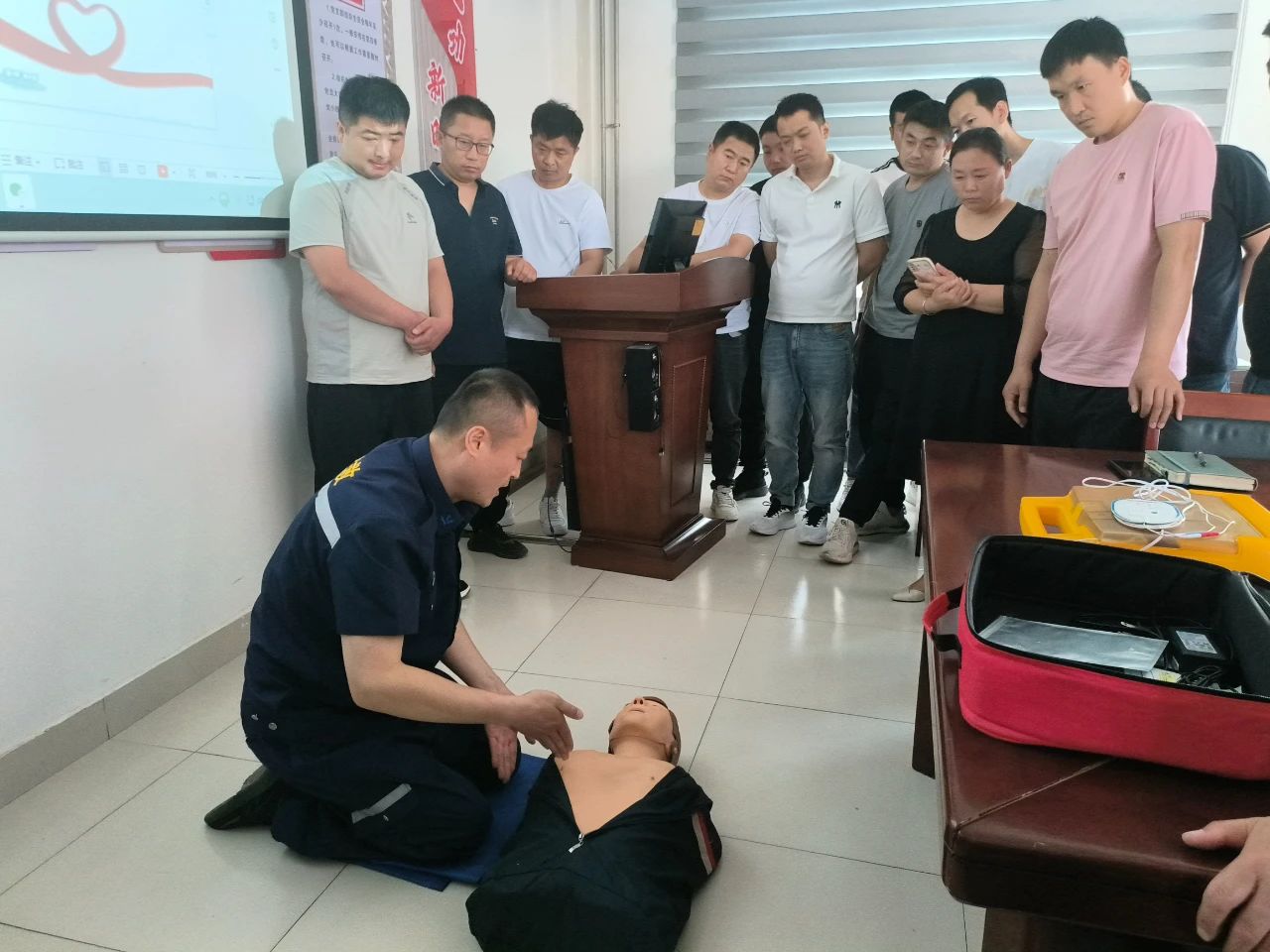 活動中,館陶縣人民醫院急診科主任丁世超首先通過圖文并茂的PPT,深入淺出地講解了心肺復蘇(CPR)的重要性、操作原理及黃金救援時間。結合真實案例,丁主任強調:“心臟驟停后的4分鐘內是搶救的關鍵期,掌握正確的CPR技能可大幅提高患者生存率。”他還詳細介紹了自動體外除顫器(AED)的使用場景及注意事項,幫助員工建立科學的急救觀念。