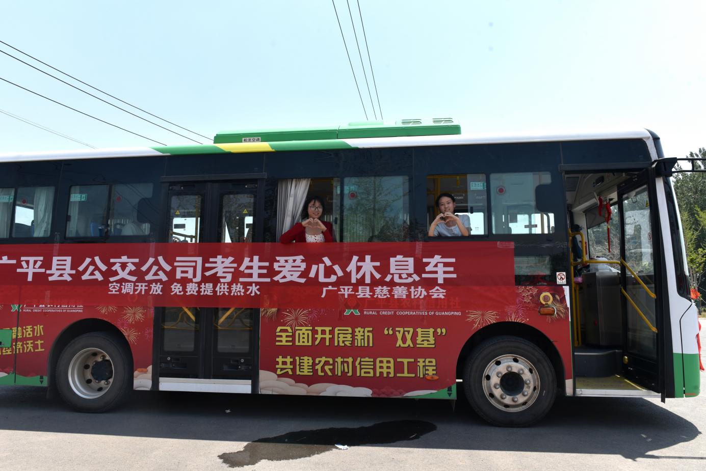 在廣平一中、育華中學考點附近,4輛公交車變身為“愛心休息站”,車內空調開放,志愿者準備了免費的熱水,助力考生補充水分和體力,幫助考生舒緩緊張情緒。車廂內還配備了應急文具和常用藥品,以滿足考生不時之需。