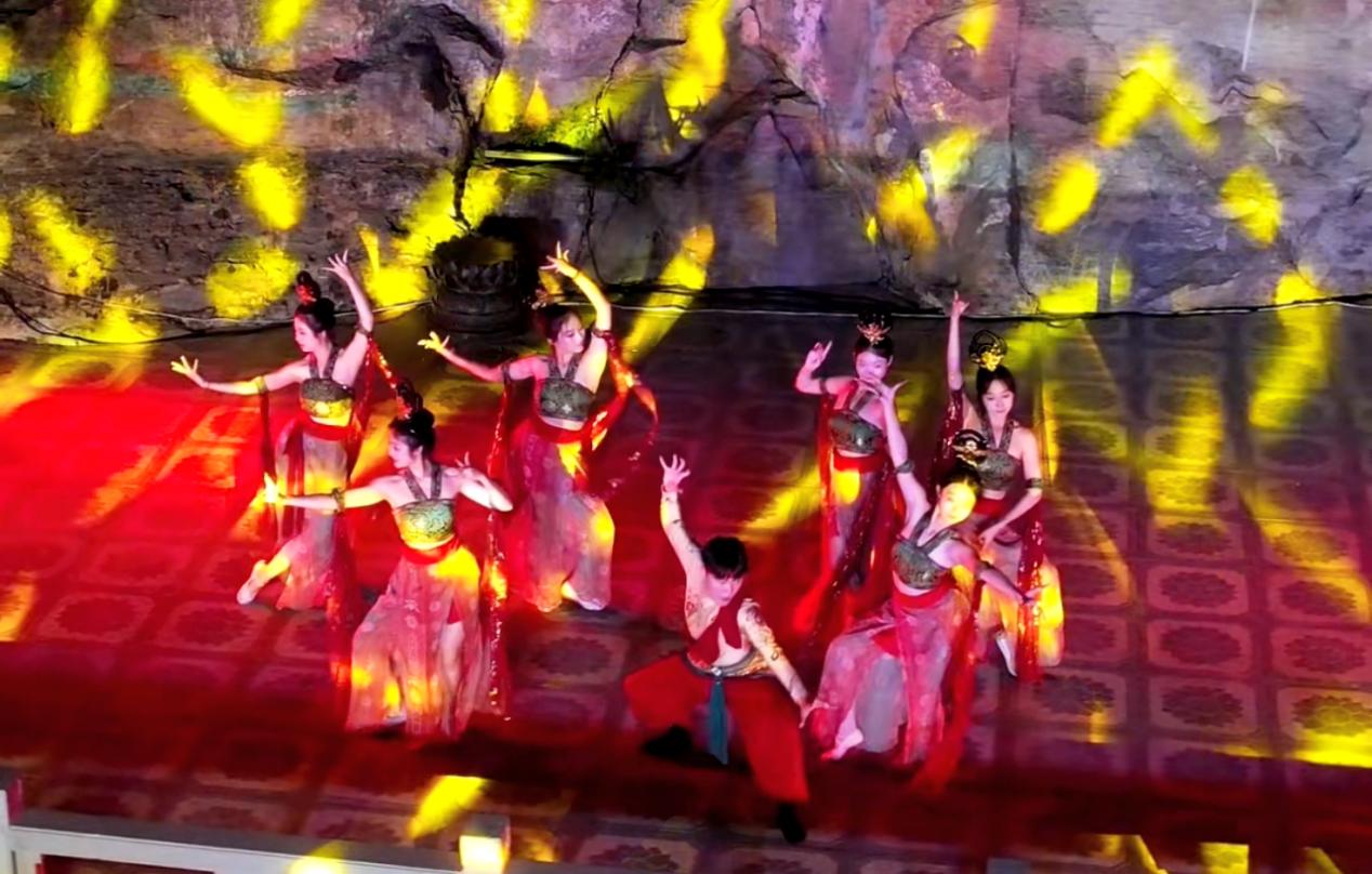這里是另一個精彩的舞臺。實景舞蹈演員們在石窟的映襯下翩翩起舞,她們的身姿輕盈優美,宛如仙女下凡。每一個舞蹈動作都與石窟的歷史文化相呼應,仿佛在訴說著千年前的故事。隨著音樂的節奏,演員們的舞蹈越來越熱烈,將現場的氣氛推向了又一個高潮。緊接著,實景光影秀《文物回家》震撼登場。古老的文物在光影的交織中仿佛復活了一般,它們穿越時空,回到了屬于它們的家園。這不僅是一場視覺的盛宴,更是一次對歷史文化的致敬。觀眾們被這壯觀的景象所震撼,紛紛拿出手機記錄下這難忘的瞬間。