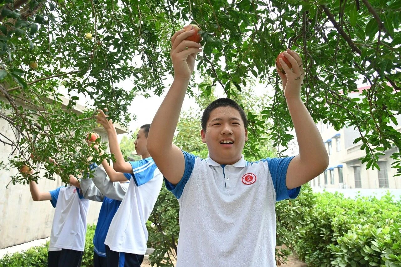 金秋風(fēng)漸起,邯鄲武安市第十中學(xué)東校區(qū)的石榴樹已是碩果累累,一顆顆飽滿的紅石榴掛滿枝頭,在秋陽的照耀下格外誘人。為豐富校園文化生活,讓學(xué)生感受勞動與收獲的快樂,9月16日, 該校組織開展了石榴采摘活動。