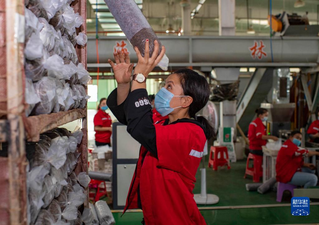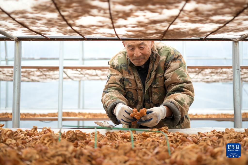 在黑龍江省綏化市明水縣興仁鎮石人村的食用菌種植基地,建檔立卡戶林德山在晾滑子蘑,他在這里打工年收入在1萬元以上(2020年10月11日攝)。新華社記者 王建威 攝