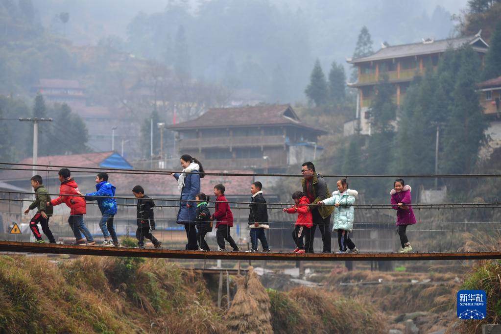 在位于廣西融水苗族自治縣和貴州省從江縣交界的烏英苗寨,鄭昌昊(右三)和妻子吳晗(左五)帶著孩子們玩耍(2021年1月30日攝)。鄭昌昊是廣西柳州市委宣傳部干部,曾于2020年4月至2021年5月在烏英苗寨擔任駐村工作隊隊員,吳晗曾多次到烏英苗寨教學點支教。新華社記者 黃孝邦 攝
