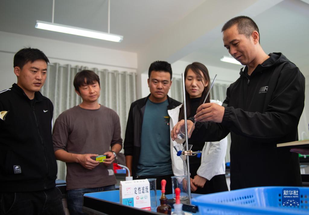 北京市援青支教教師、來自通州區陸辛莊學校的化學教師祁生貴(右一)在青海省玉樹州第四民族高級中學指導學校教師進行實驗教學(2020年8月12日攝)。新華社記者 陳鐘昊 攝