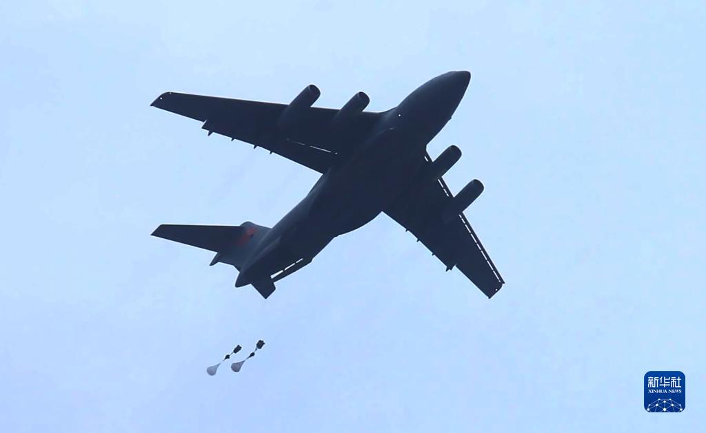 中國空軍大型運輸機運-20與空降兵部隊聯合開展空降空投訓練(資料照片)。新華社發