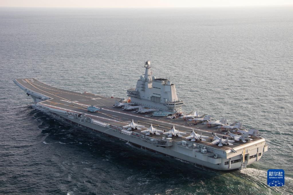 在某海域,山東艦殲-15艦載機列陣甲板(2020年12月1日攝)。新華社發(李達 攝)