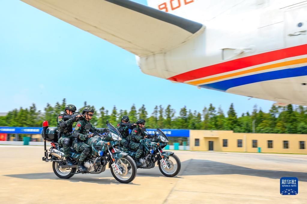 武警上海總隊機動第一支隊特戰某中隊組織交通工具反劫持綜合演練,特戰隊員乘坐摩托車接近“被劫持飛機”(2022年8月1日攝)。新華社發(李巖 攝)
