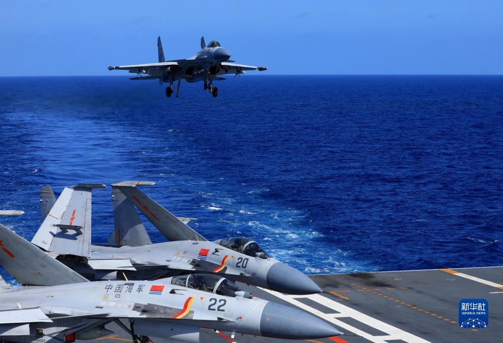 海軍遼寧艦編隊遠海實戰化訓練期間,殲-15艦載戰斗機準備著艦(資料照片)。新華社發(胡善敏 攝)