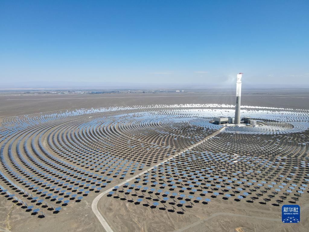 在新疆伊吾縣淖毛湖鎮(zhèn)拍攝的哈密50兆瓦熔鹽塔式光熱發(fā)電站(2021年8月22日攝,無人機(jī)照片)。作為新疆第一座光熱發(fā)電站,哈密50兆瓦熔鹽塔式光熱發(fā)電站不僅污染物零排放,還通過儲存熱能實(shí)現(xiàn)24小時(shí)持續(xù)發(fā)電。新華社記者 高晗 攝