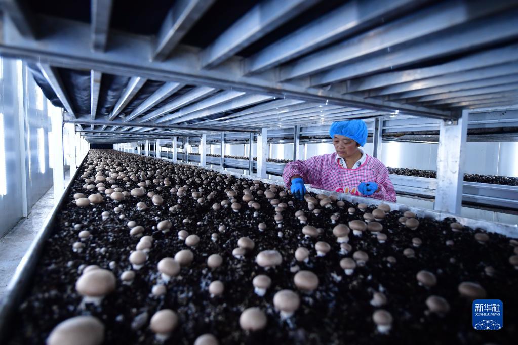 在河南蘭考縣東壩頭鄉(xiāng)張莊村,一名村民在一食用菌企業(yè)的車間內(nèi)采摘褐蘑菇(2018年6月21日攝)。新華社記者 馮大鵬 攝