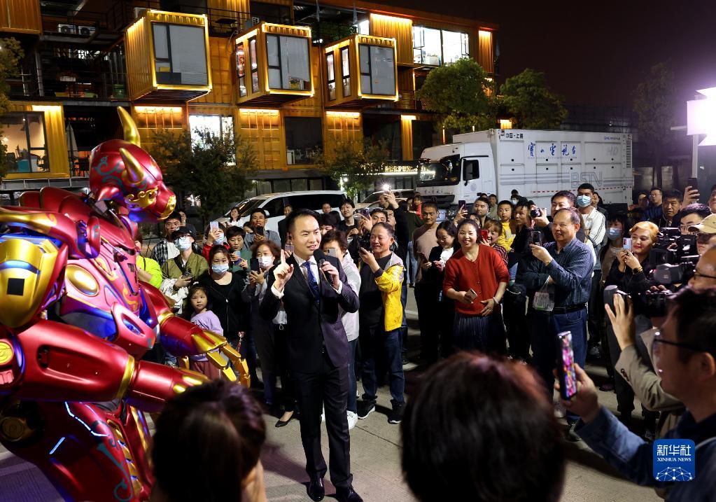 2021年4月30日,消費者在上海市智慧灣“五五購物節”活動現場了解導購機器人。新華社記者 陳飛 攝