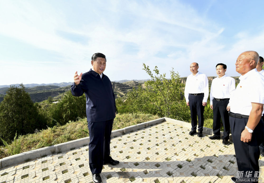 ↑2021年9月13日下午,習近平在陜西省榆林市米脂縣銀州街道高西溝村龍頭山山頂,考察黃土丘陵溝壑區綜合治理情況。