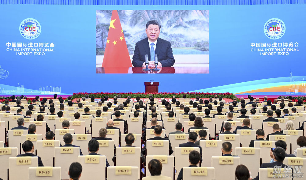 ↑2021年11月4日晚,習近平以視頻方式出席第四屆中國國際進口博覽會開幕式并發表題為《讓開放的春風溫暖世界》的主旨演講。