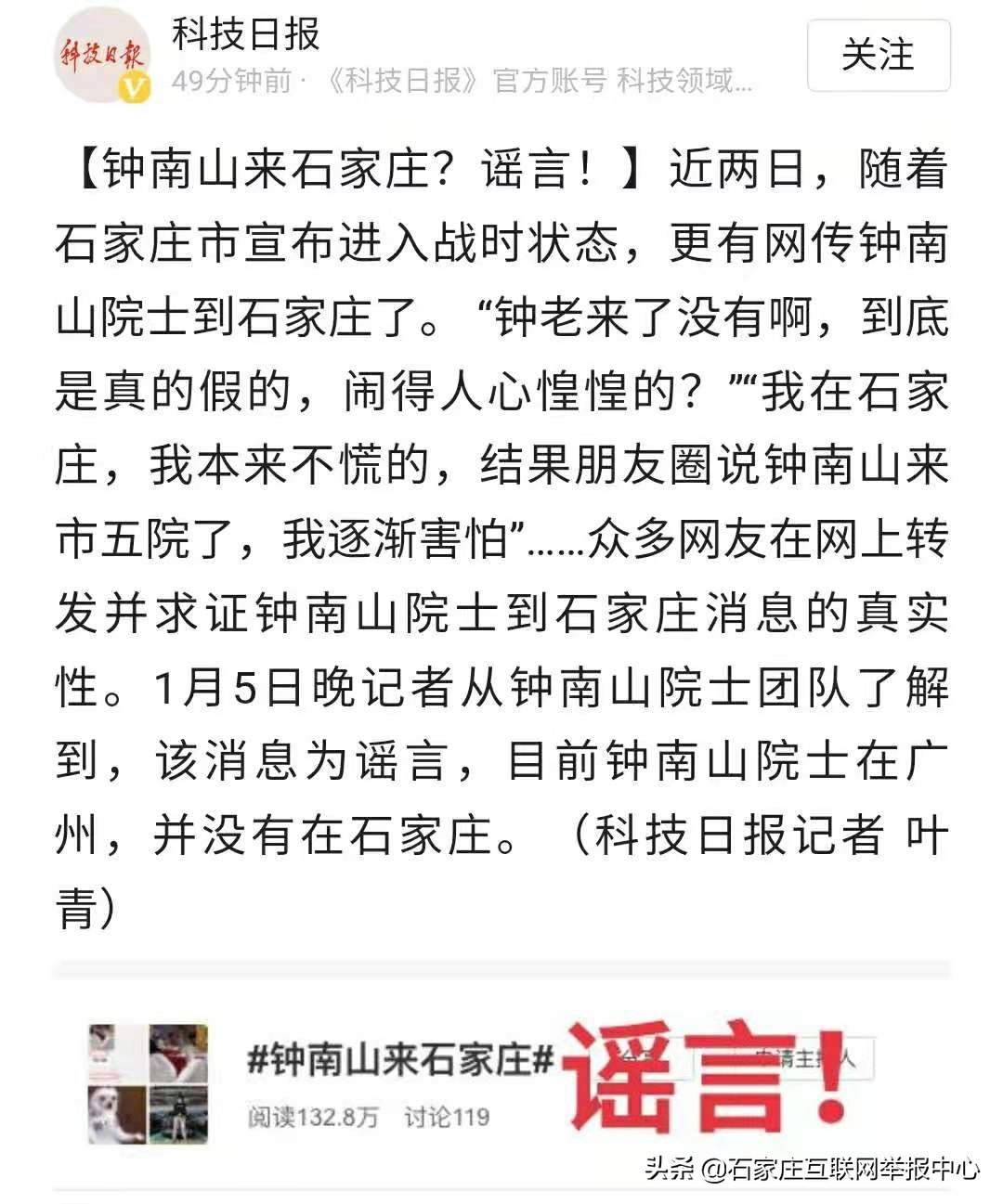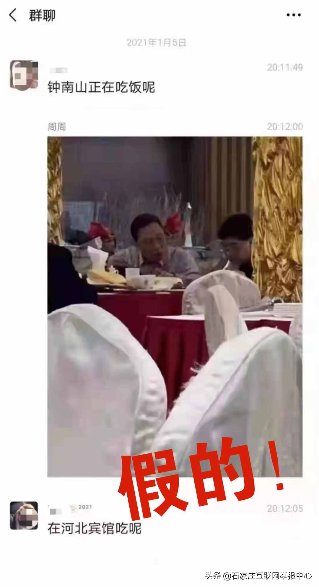 5日,一則“鐘南山來石家莊了”的消息在網(wǎng)絡(luò)大量傳播,并配圖片稱鐘南山在河北賓館、鳳凰酒樓等飯店就餐。經(jīng)石家莊互聯(lián)網(wǎng)舉報(bào)中心向有關(guān)部門核實(shí),鐘南山院士并不在石家莊。