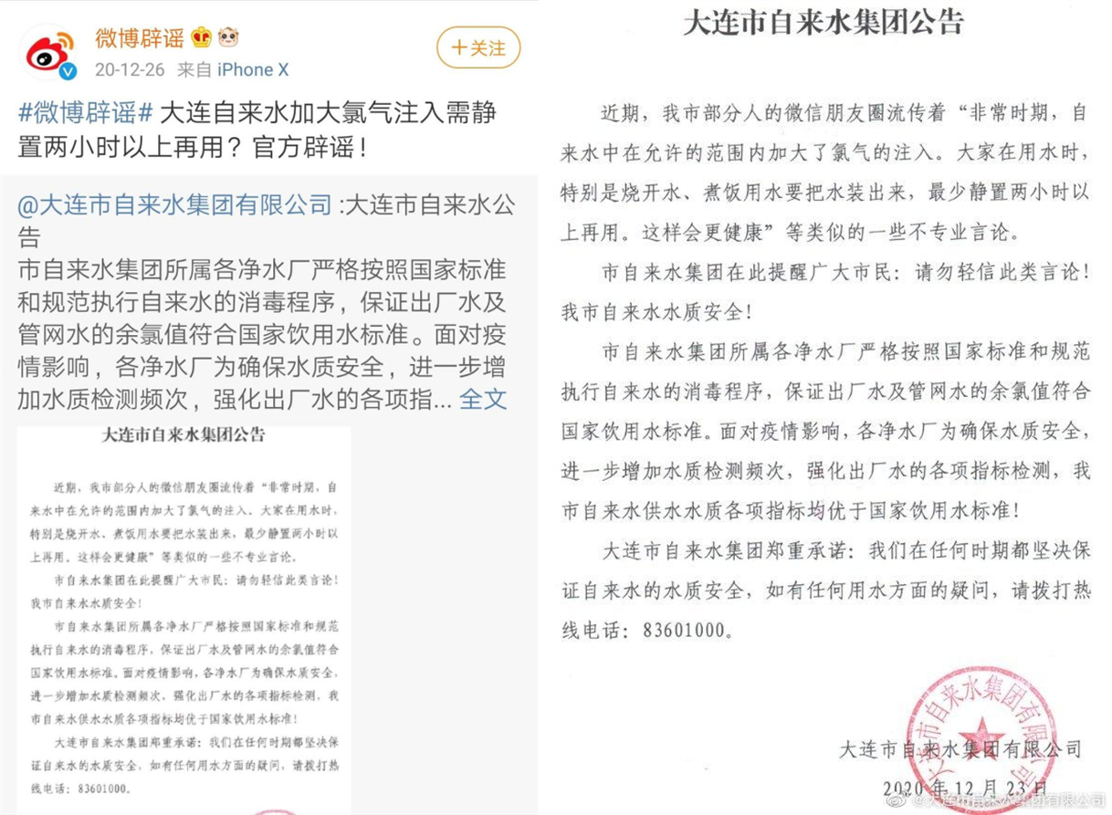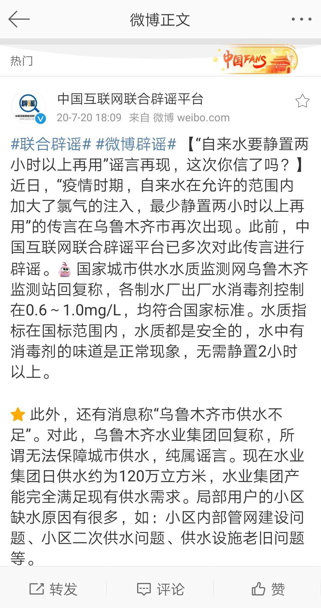 圖為中國互聯網聯合辟謠平臺官方微博辟謠“自來水要靜置兩小時以上再用”。