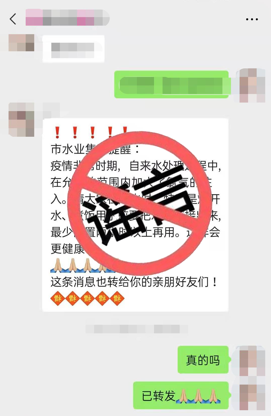 近日,有人再次通過微信等渠道散布“市水業集團提醒:疫情非常時期,自來水處理過程中,在允許的范圍內加大了氯氣的注入。請大家在用水時,特別是燒開水、煮飯用水前要把水提前接出來,最少靜置兩小時以上再用。這樣會更健康!這條消息也轉給你的親朋好友們!”不實信息。