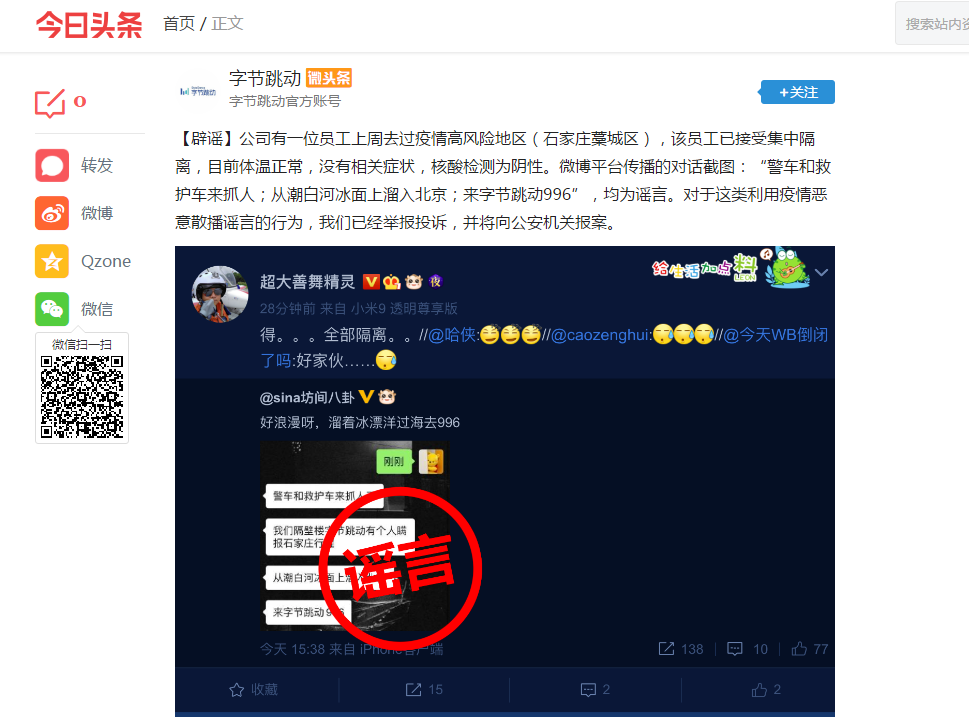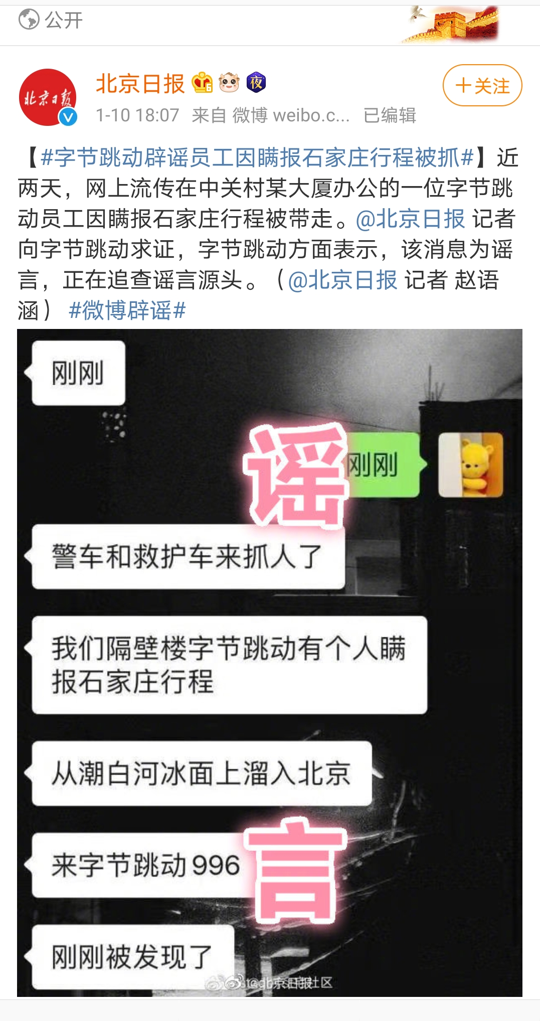在此期間,網上流傳在中關村某大廈辦公的一位字節跳動員工因瞞報石家莊行程被帶走。經記者向字節跳動求證,字節跳動方面表示,該消息為謠言,正在追查謠言源頭。