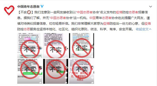 近日,中國青年志愿者協會官方微博發布消息稱,網傳“中國志愿者協會招募疫情防控志愿者”等消息系不實信息。