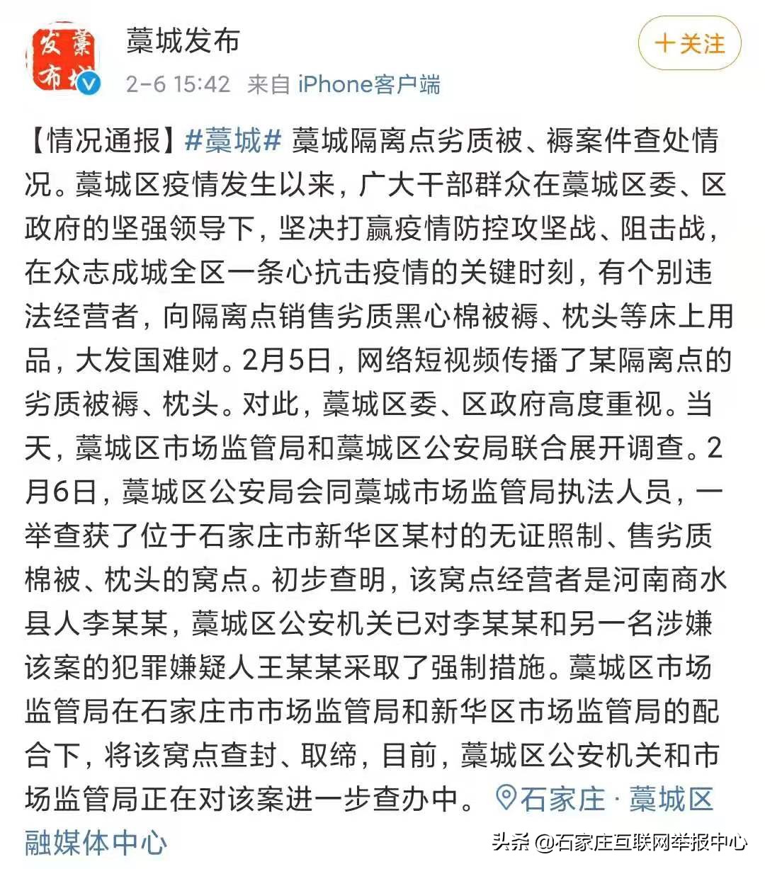近日,網絡流傳一則視頻反映石家莊藁城區某隔離點給志愿者和隔離人員發放劣質被褥。6日下午,藁城區發布調查情況,有個別違法經營者向隔離點銷售劣質黑心棉被褥、枕頭等床上用品,大發國難財,市場監管部門和公安部門聯合展開調查,于2月6日查獲了位于石家莊新華區某村的無證照制、售劣質棉被、枕頭的窩點。公安機關已對該窩點經營者李某某和另一名涉嫌該案的犯罪嫌疑人王某某采取了強制措施,市場監管部門將該窩點查封、取締,目前,公安機關和市場監管部門正在對該案進一步查辦中。