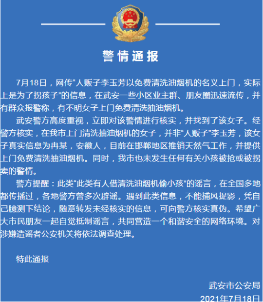 7月18日,網傳“人販子李玉芳以免費清洗油煙機的名義上門,實際上是為了拐孩子”的信息,在武安一些小區業主群、朋友圈迅速流傳,并有群眾報警稱,有不明女子上門免費清洗抽油煙機。武安警方高度重視,立即對該警情進行核實,并找到了該女子。經警方核實,在我市上門清洗抽油煙機的女子,并非“人販子”李玉芳,該女子真實信息為冉某,安徽人,目前在邯鄲地區推銷天然氣工作,并提供上門免費清洗抽油煙機。同時,我市也未發生任何有關小孩被搶或被拐賣的警情。警方提醒:此類“此類有人借清洗油煙機偷小孩”的謠言,在全國多地都傳播過,各地警方曾多次辟謠。遇到此類信息,不能捕風捉影,憑自己臆測下結論,隨意轉發未經核實的信息,可向警方核實真偽。希望廣大市民朋友一起自覺抵制謠言,共同營造一個和諧安全的網絡環境。對涉嫌造謠者公安機關將依法調查處理。特此通報